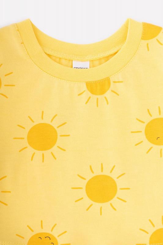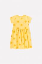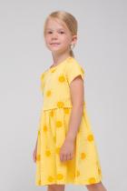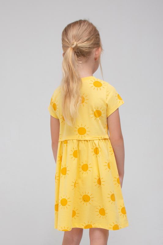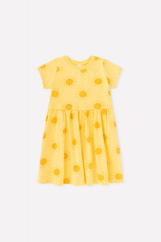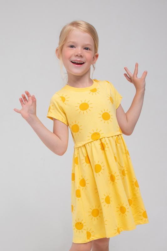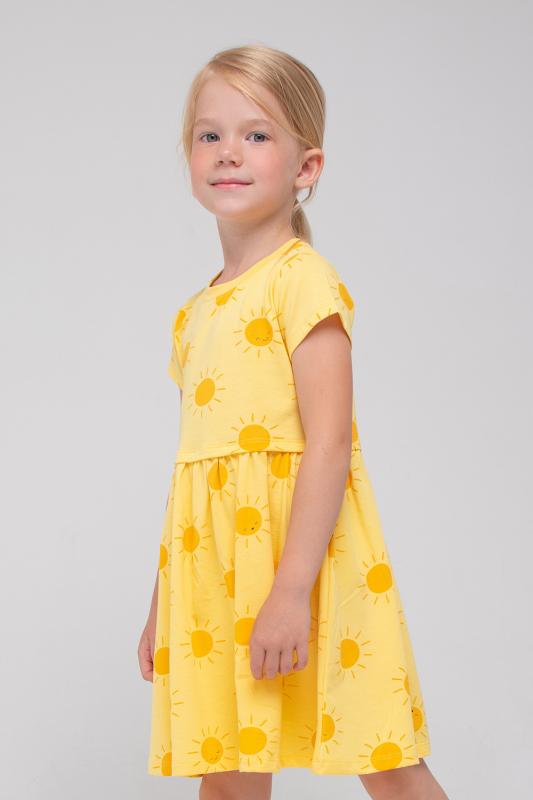 Лёгкое отрезное платье для девочки Crockid с короткими рукавами. Сшито из трикотажа супрем с набивными солнышками. Присборено на талии. Рукава, край кокетки и низ изделия обработаны плоскими швами.