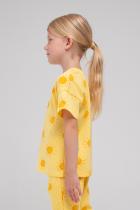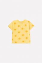 Лёгкая футболка с короткими рукавами и спущенными плечами. Сшита из трикотажа супрем. Украшена набивным рисунком. Рукава и низ футболки обработаны плоскими швами.