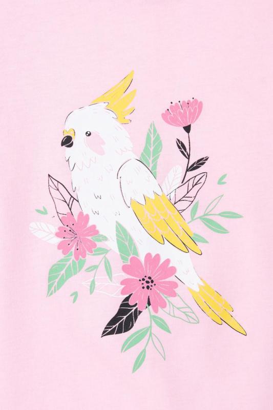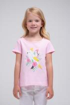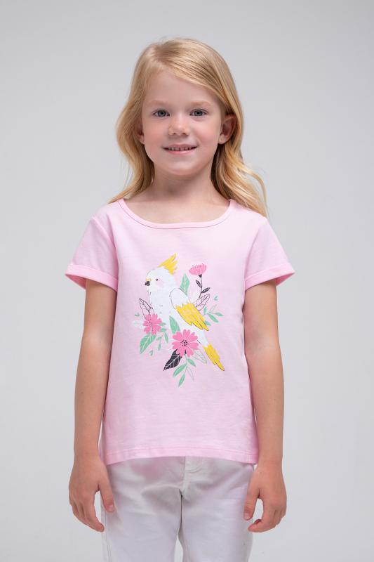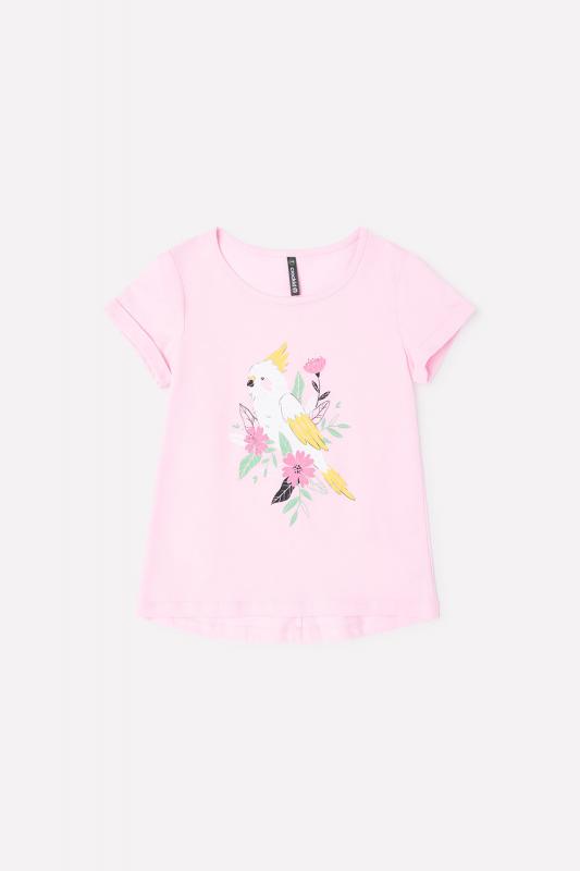 Хлопковая туника для девочки Crockid розового оттенка с изображением птицы какаду. Для удобства одевания в 92 и 98 размерах застёгивается на кнопки на плече. Спинка удлинена и закруглена. На рукавах закреплённые отвороты.