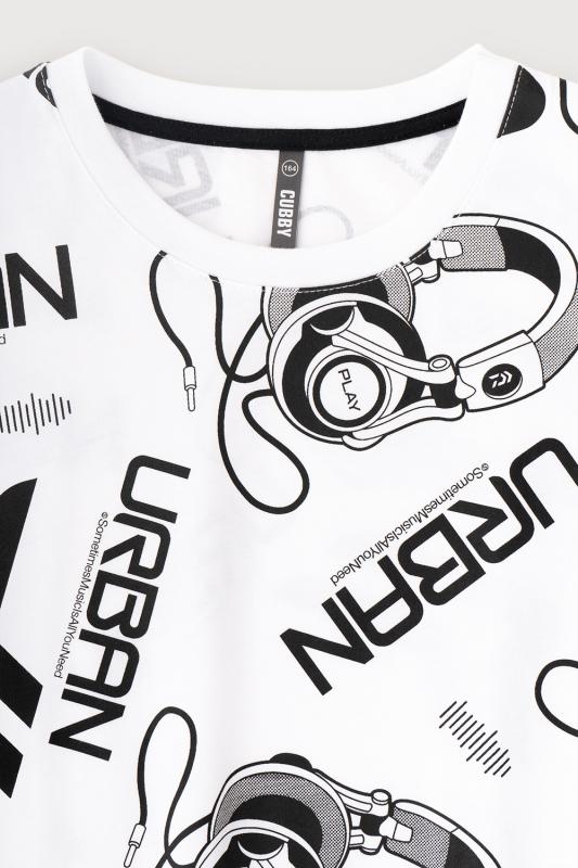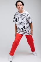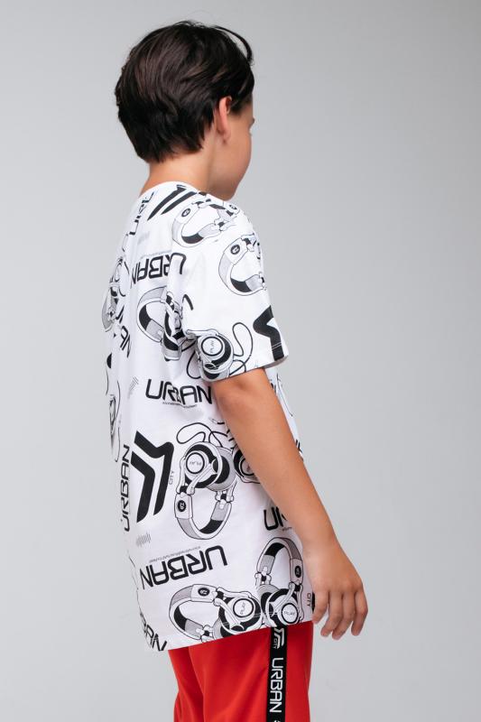 Хлопковая футболка мальчика с короткими втачными рукавами. Сшита из лёгкого трикотажа супрем и украшена набивным рисунком. Рукава и низ изделия обработаны плоскими швами.