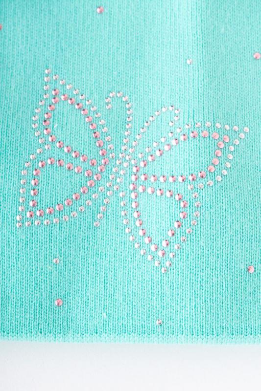 Шапка для девочки Crockid из акриловой пряжи бирюзового оттенка с внутренним отворотом. Украшена аппликацией из страз в форме бабочки.