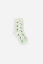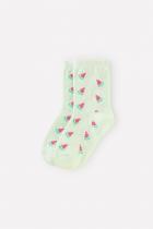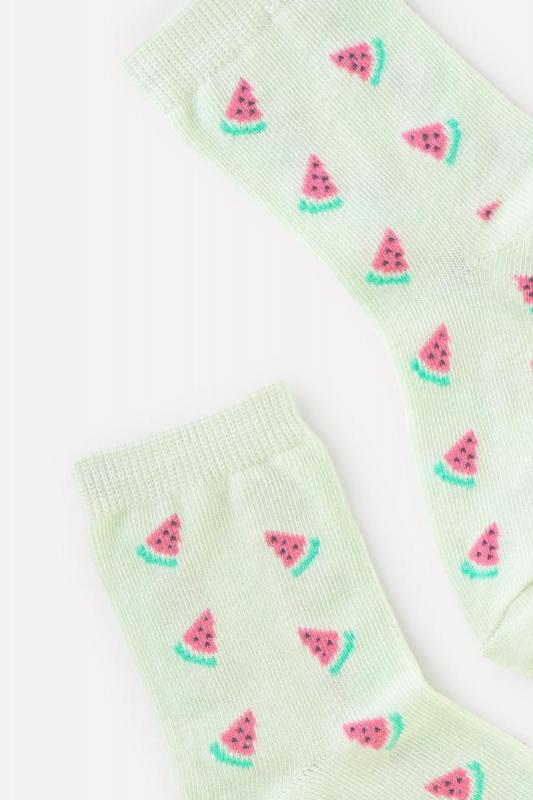 Длинные трикотажные носки для девочки. Эластичная резинка по верхнему краю. Украшены рисунком с изображением кусочков арбуза.