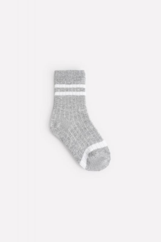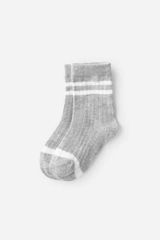 Длинные трикотажные носки для мальчика. Эластичная резинка по верхнему краю, рельефный узор. Украшены контрастными полосками.