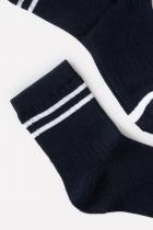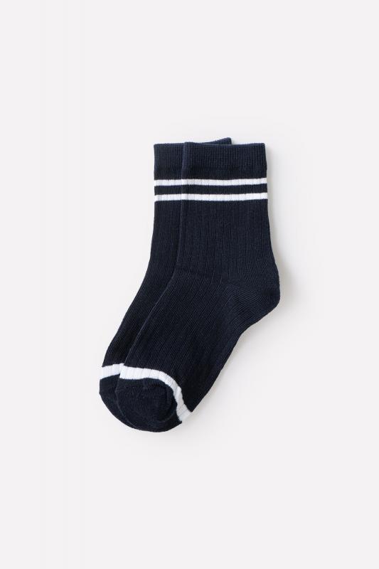 Длинные трикотажные носки для мальчика. Эластичная резинка по верхнему краю, рельефный узор. Украшены контрастными полосками.