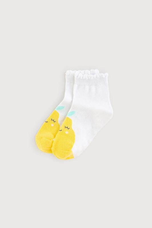 Короткие трикотажные носки с противоскользящей подошвой для девочки. Эластичная резинка по верхнему краю. Украшены рисунком с изображением груши