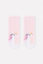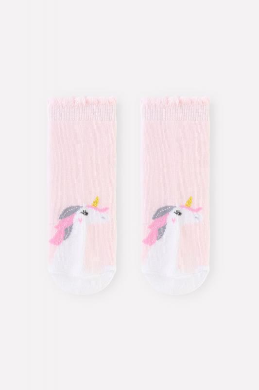 Короткие трикотажные носки с противоскользящей подошвой для девочки. Эластичная резинка по верхнему краю. Украшены рисунком с изображением единорога.