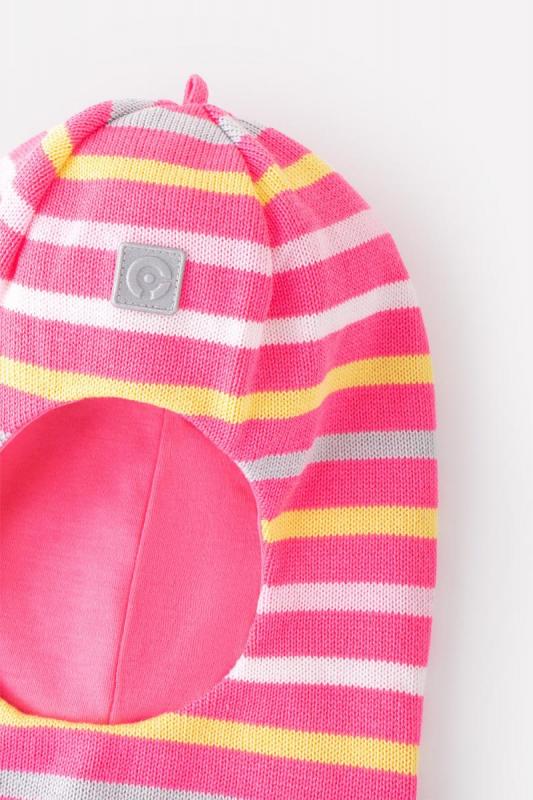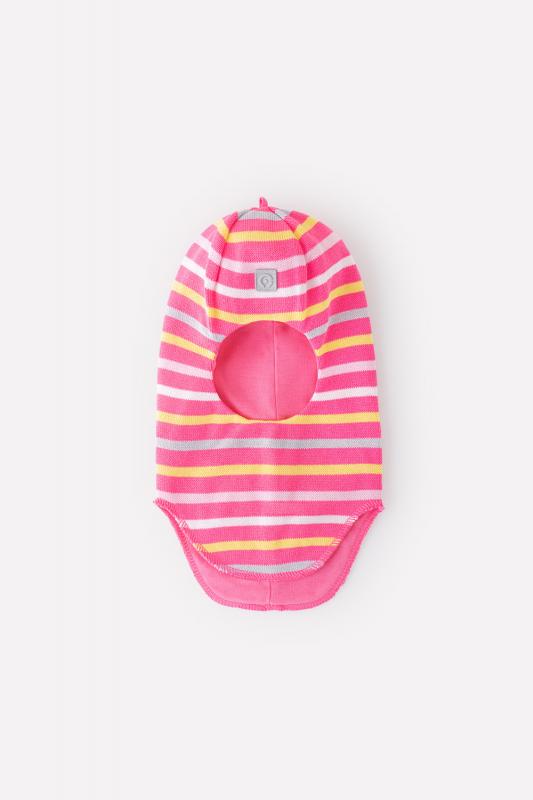 Шапка-шлем для девочки Crockid из хлопковой пряжи с рисунком в полоску. Внутри - мягкая подкладка из интерлока. Для безопасности в тёмное время суток на передней части шапочки прикреплён светоотражатель. На макушке рулик.