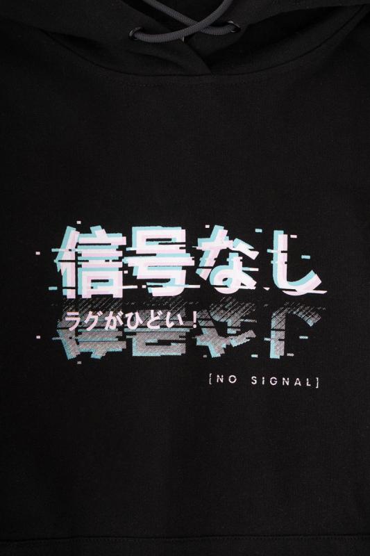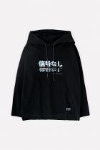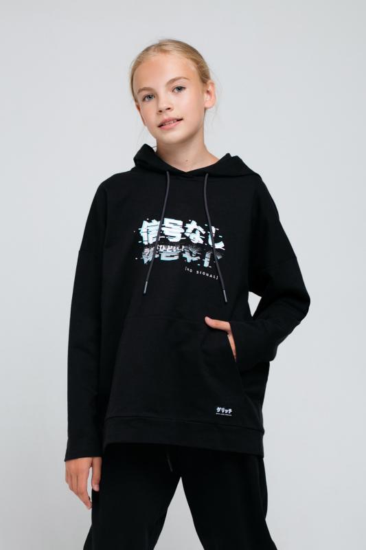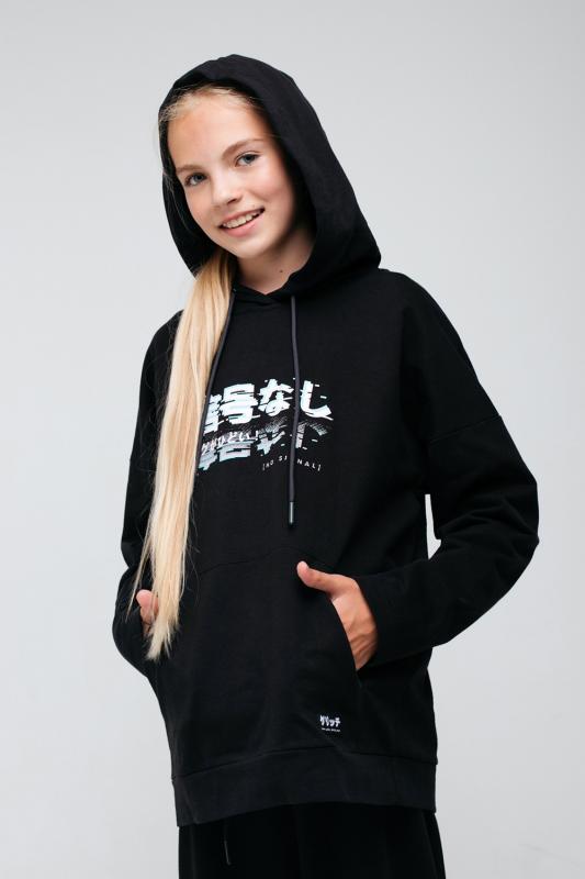 Толстовка для девочки оверсайз с капюшоном. Сшита из футера петли. Капюшон с мягким хлопковым подкладом утягивается с помощью шнурка. Рукава со спущенными плечами по низу обработаны плоскими швами. Внизу мягкий пояс. Украшена принтом. На животе вместительный карман-кенгуру с жаккардовой нашивкой.