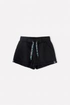 Чёрные шорты с широким поясом на резинке. Сшиты из хлопкового трикотажа футер петля. Регулируются по ширине с помощью ленты. По бокам удобные карманы. Внизу - закреплённые отвороты.