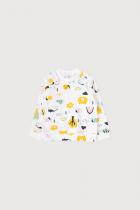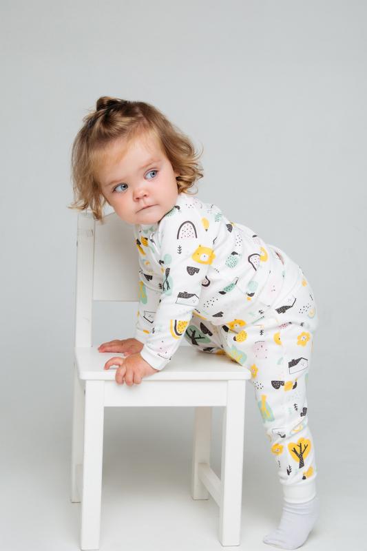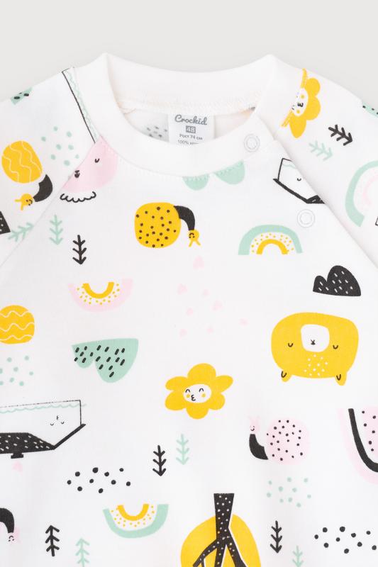 Хлопковый джемпер Crockid с длинными втачными рукавами. Сшит из мягкого трикотажа интерлок и украшен набивным рисунком с домиками в лесу. Застёгивается на кнопки спереди на плече. Длинные рукава оканчиваются эластичными манжетами. Внизу - мягкий пояс.