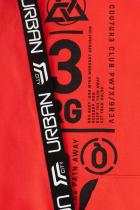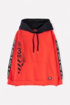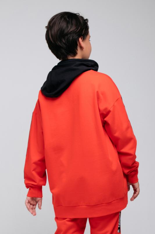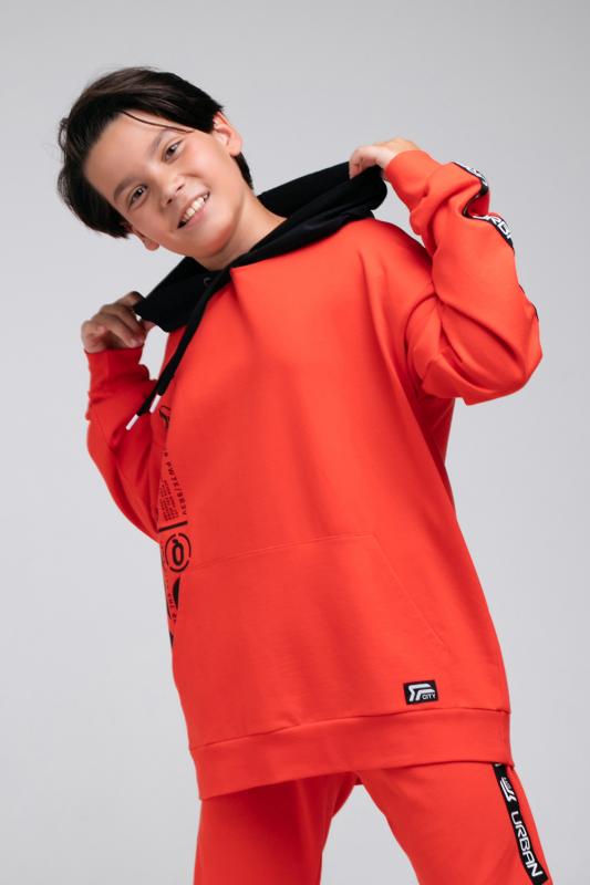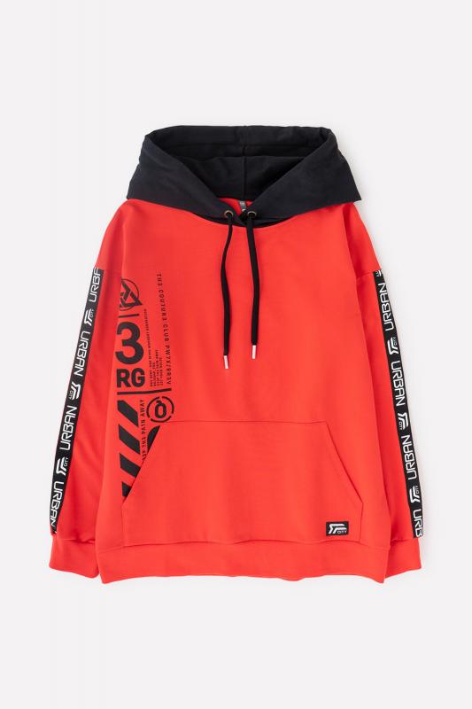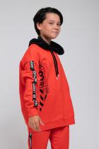Красная толстовка для мальчика с тонким чёрным капюшоном из петельчатого футера. Капюшон утягивается с помощью шнурка. Рукава украшены чёрными лентами с белыми надписями. Спущенные плечи придают свободный объём. Мягкие пояс и манжеты выполнены из эластичного материала с добавлением лайкры. На животе удобный вместительный карман-кенгуру, украшенный жаккардовой нашивкой.