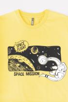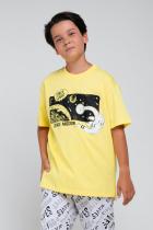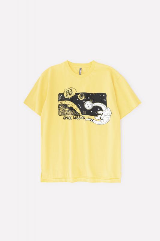 Хлопковая футболка для мальчика с короткими рукавами. Сшита из лёгкого трикотажа супрем и украшена принтом на груди. По бокам разрезы. Спинка удлинена. Рукава и низ изделия обработаны плоскими швами.