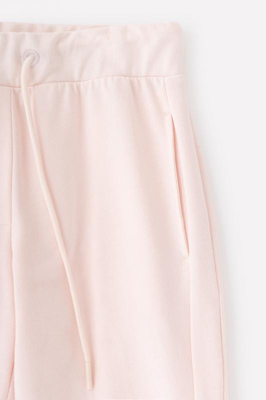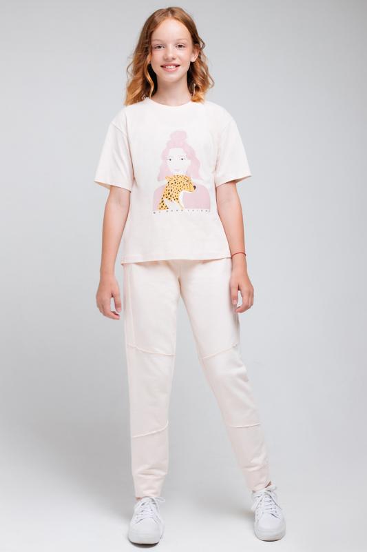Брюки для девочки с поясом на резинке. Сшиты из хлопкового трикотажа футер петля. Пояс регулируется по ширине с помощью шнурка. По бокам удобные карманы. Внизу - эластичные манжеты. Украшены декоративными швами с открытыми срезами.