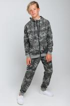 Брюки для мальчика из набивного петельчатого футера в камуфляжной расцветке. Пояс регулируется по ширине с помощью шнурка. Внизу эластичные манжеты. Украшены лентой с принтом по бокам.