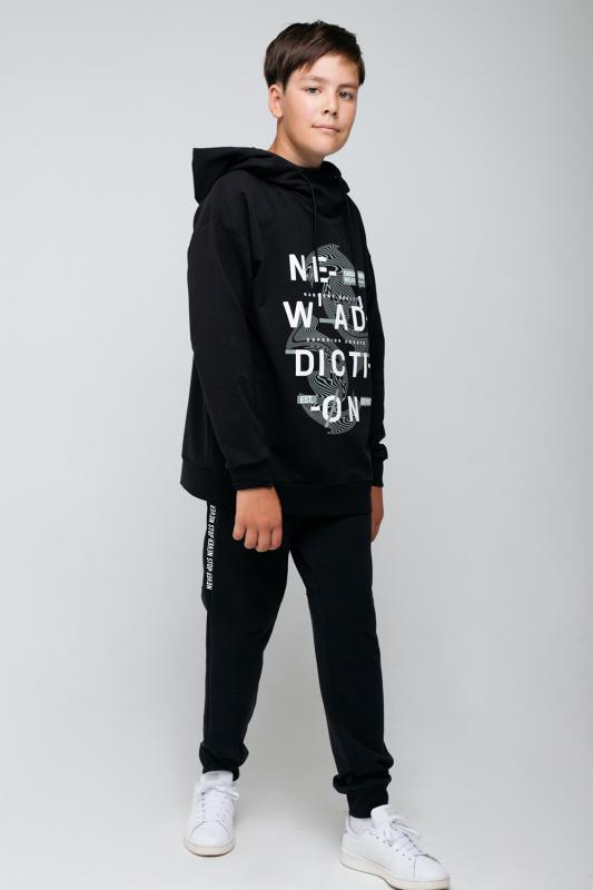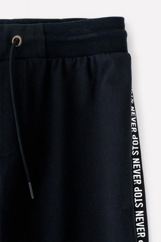 Брюки из однотонного петельчатого футера чёрного цвета для мальчика. Пояс регулируется по ширине с помощью шнурка. Внизу эластичные манжеты. Украшены лентой с принтом по бокам.