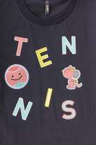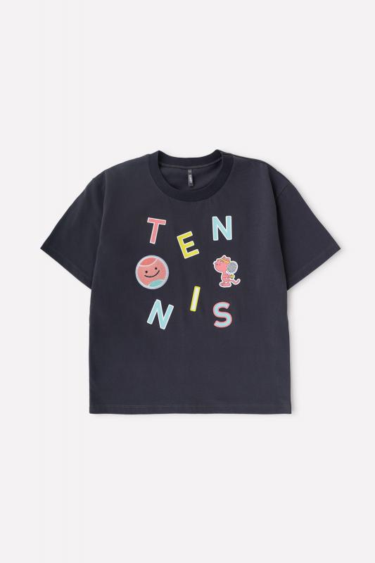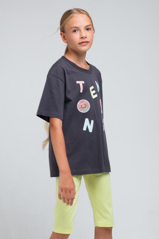 Однотонная футболка для девочки из тонкого хлопкового трикотажа супрем. Украшена нашивкой и крупным принтом с надписью на груди. Короткие рукава со спущенными плечами и низ изделия обработаны плоскими швами.