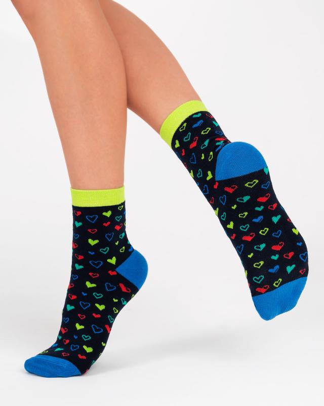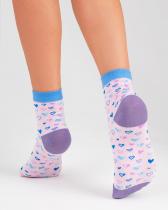 Прелестные женские носки с сердцами, изображенными по всей длине изделия. Связаны из натурального гребенного хлопка, благодаря чему вы будете чувствовать себя комфортно в течение всего дня. Гармоничное сочетание цветной основы и рисунка сердец никого не оставит равнодушным, а красочные мысок, пятка и борт дополнят стильными акцентами ваш наряд.