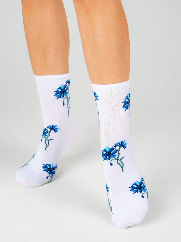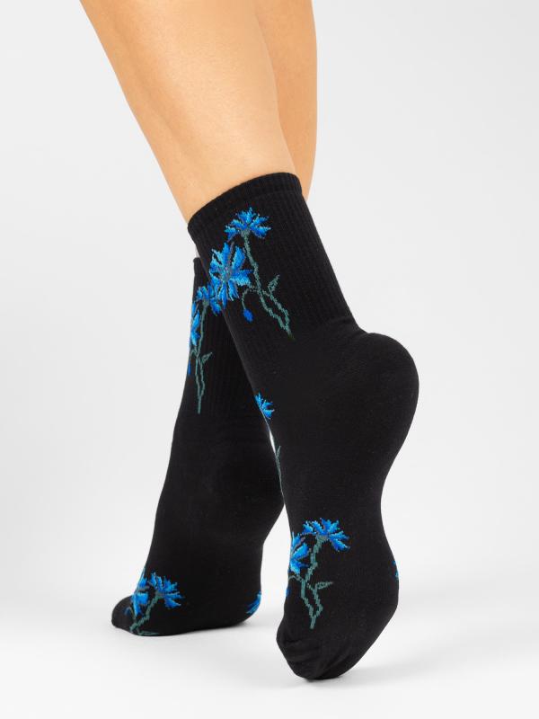 Носки с рисунком цветов василька – актуальный тренд сезона весна-лето. Модель из натурального гребенного хлопка подходит для повседневной носки. Благодаря широкой спортивной резинке, в таких носочках будет комфортно заниматься спортом или отправиться на прогулку.