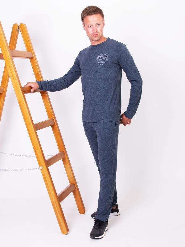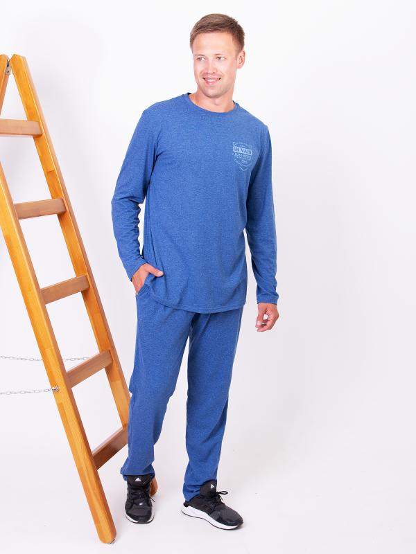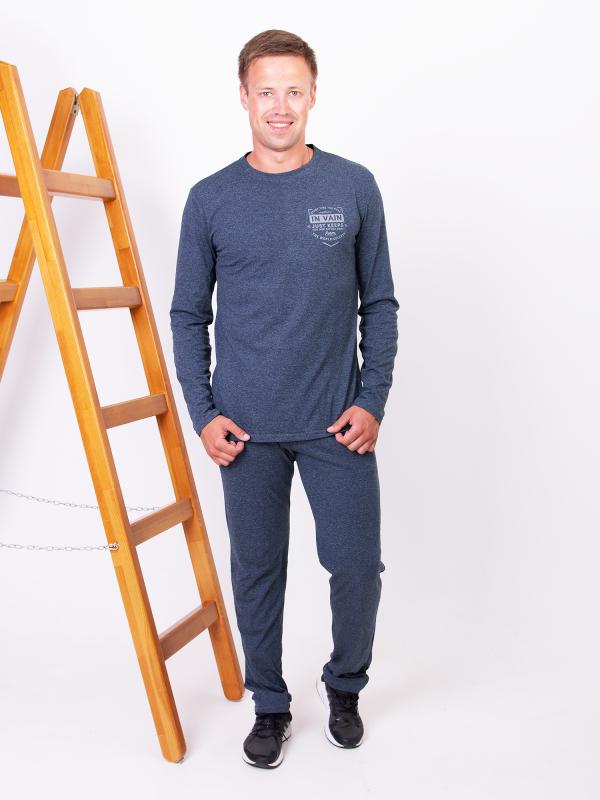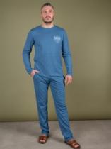 Домашний мужской костюм состоит из брюк и лонгслива с принтом. Лонгслив с длинным рукавом полуприлегающего силуэта. Длинные пижамные штаны на резинке ,шириной 3 см прямого силуэта с отстрочными карманами в боком шве .Костюм выполнен из натурального 100% хлопка, что делает его воздухопроницаемым, гидроскопичным и гипоаллергенным. Ткань риятная мягкая к телу ткань.