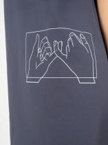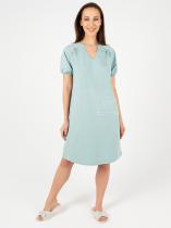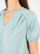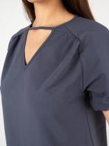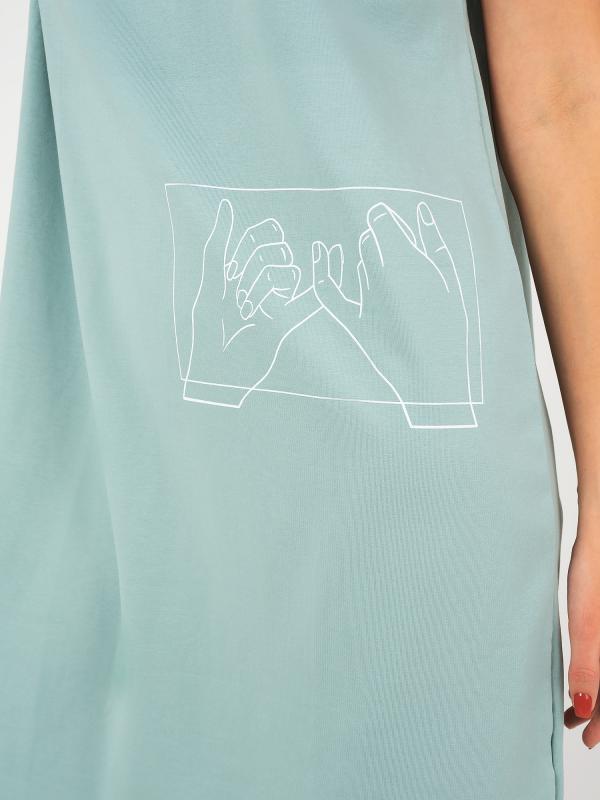 Туника прямого силуэта, длинной до уровня чуть выше колена. Горловина с фигурным вырезом срез горловины обработан кантом переходящий в декоративный узкий бантик. Рукав-реглан короткий, собранный к низу. На полочке расположен лаконичный принт .