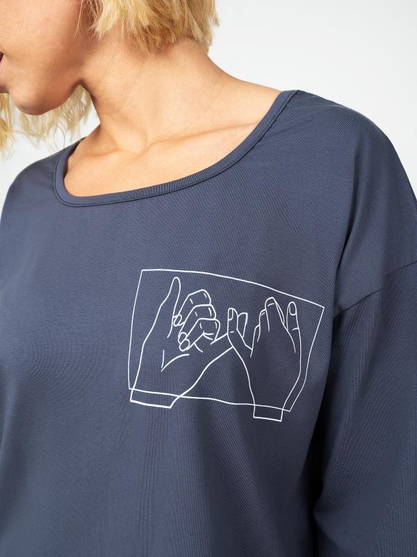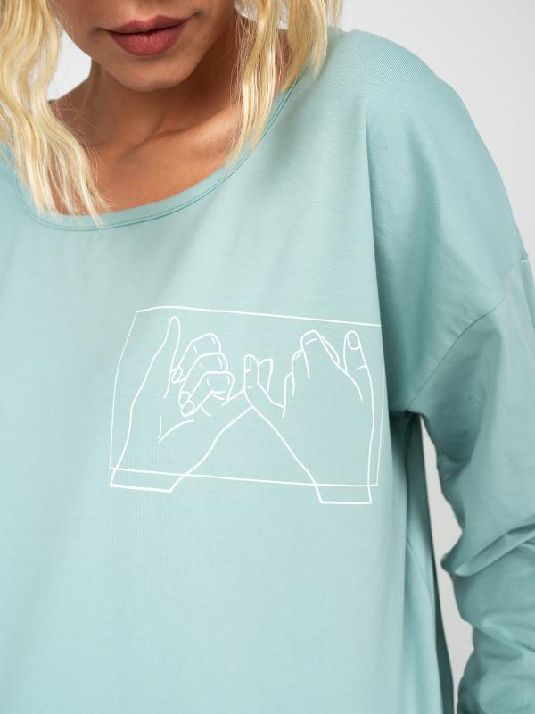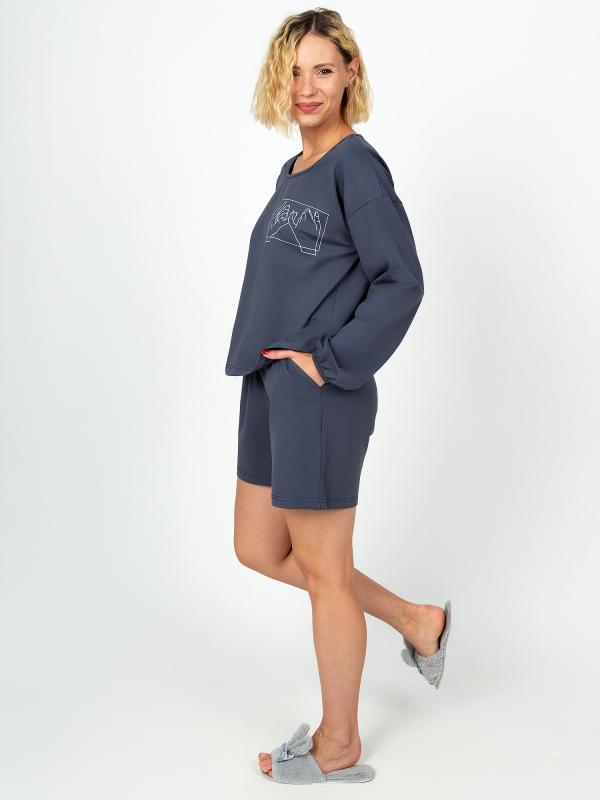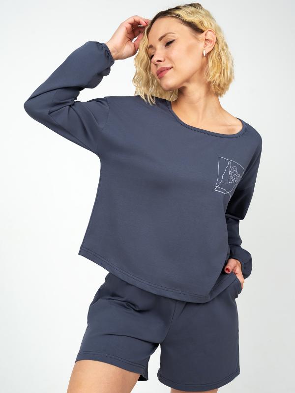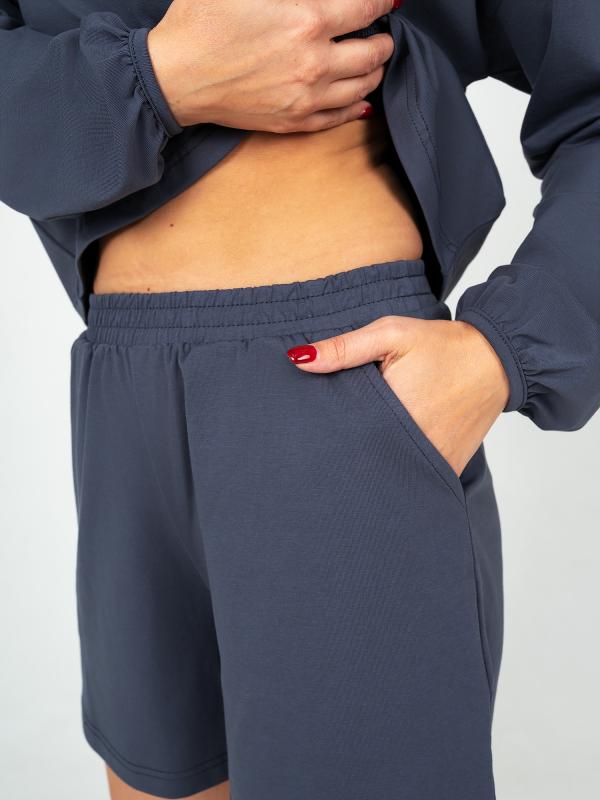 Женский костюм состоит из лонгслива и шорт. Лонгслив укороченный ,свободного кроя, длинной до уровня чуть выше бедер. Горловина фигурной формы . Рукав спущенный расширенный к низу и собран на кант . Шорты с отрезным поясом , полуприлегающего силуэта, длинной до уровня чуть выше колена, с 2 отрезными карманами.