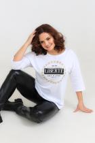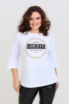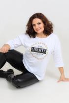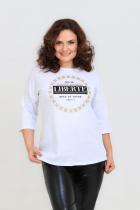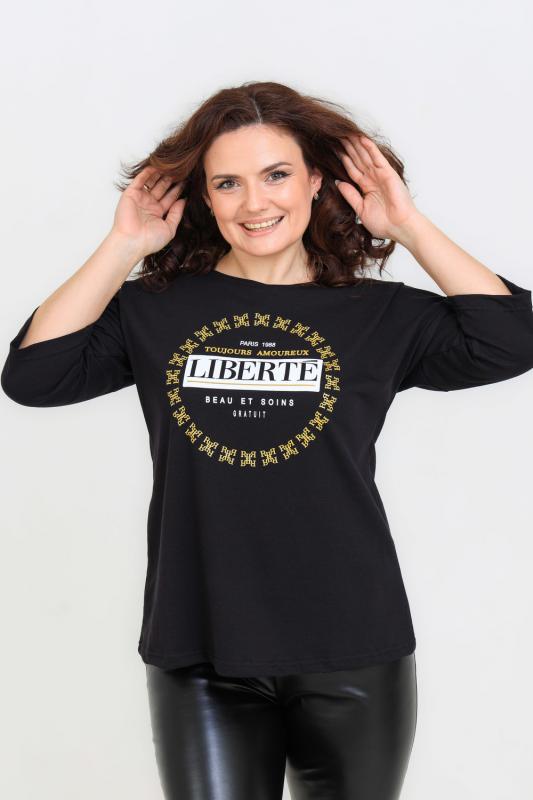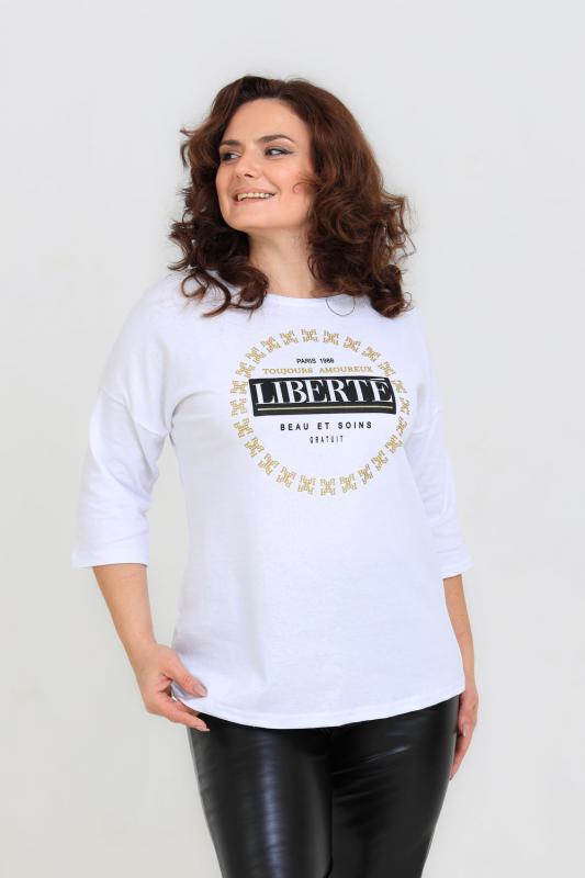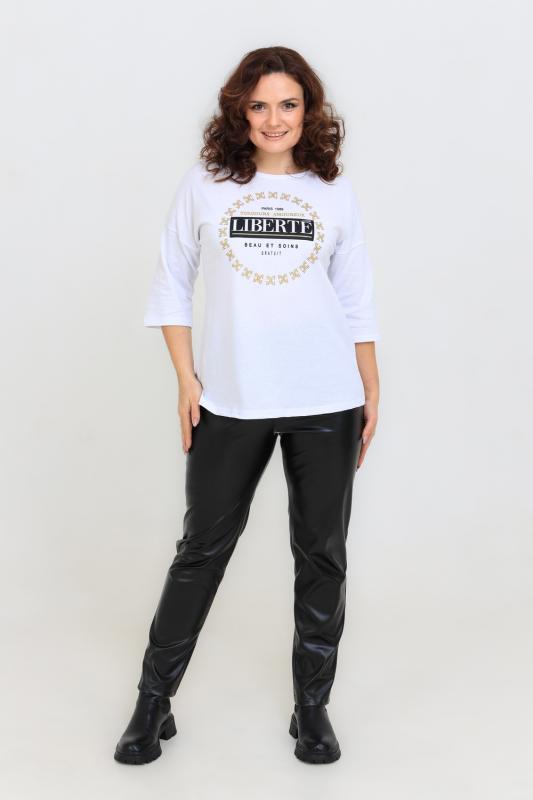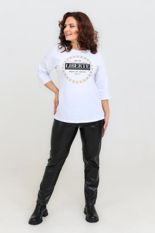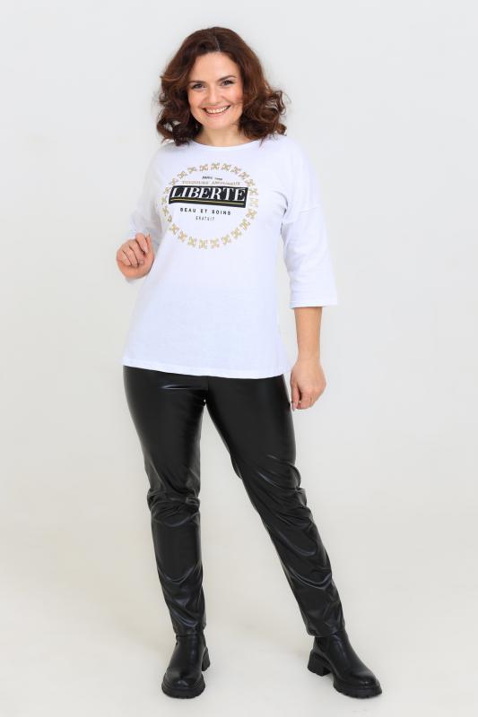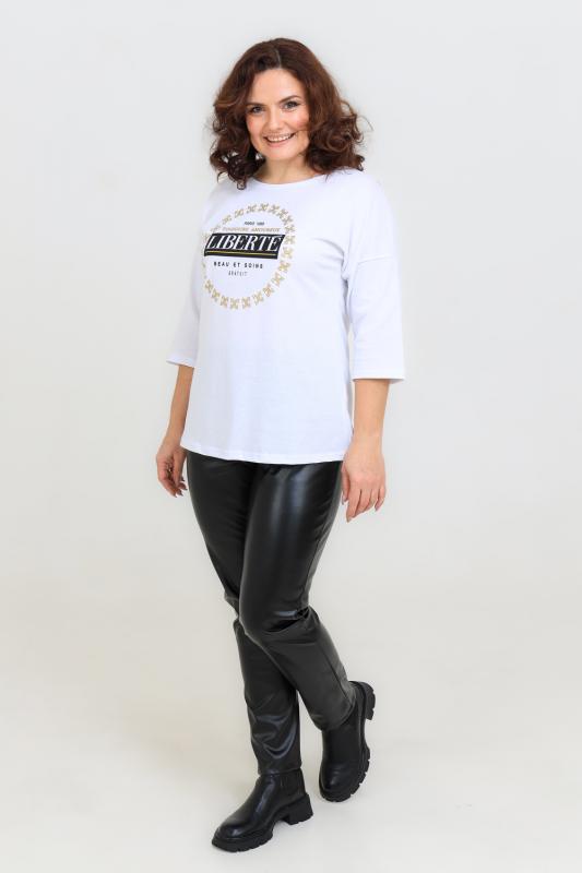 Женская футболка свободного кроя длиной до середины бедра с круглым вырезом горловины. Базовые цвета - белый и черный прекрасно впишутся в любой образ. Модели средней длины прекрасно смотрятся с брюками-дудочками или облегающими джинсами. В прохладную погоду хорошо будет смотреться в паре с утепленной жилеткой или курткой. Принт из золотого глиттера выигрышно смотрится на белом и черном цвете.