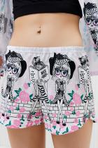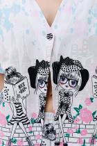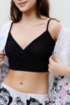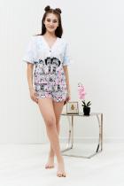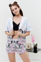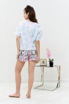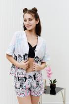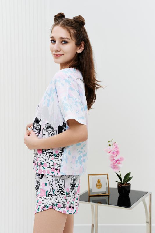 Комплект состоит из топа, шорт и короткой рубашки. Топ из эластичного полотна, на тонких бретелях, длиной выше линии талии. Горловина и бретели топа обработаны бейкой из основного полотна. Рубашка выполнена из отделочного полотна из кулирки, полуприлегающего силуэта, длиной ниже талии, с коротким рукавом, с застежкой на одну пуговицу. Горловина обработана обтачкой. Шорты широ