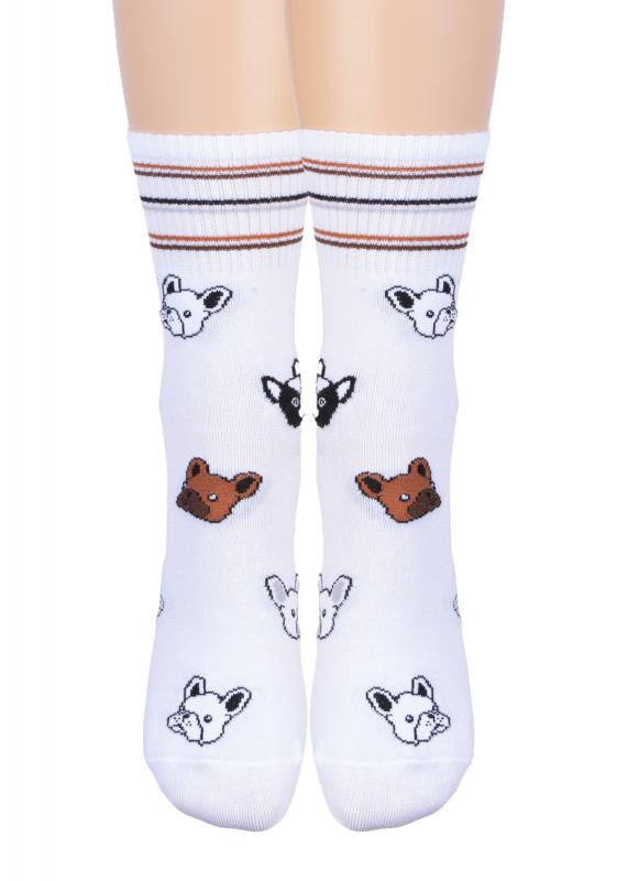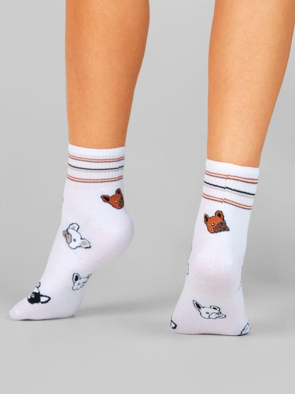 Женские носки с рисунком бульдогов. Натуральный гребенной хлопок в составе изделия обеспечит удобство и отличную воздухопроницаемость, препятствуя потоотделению и раздражению кожи ног. Эластичная резинка отлично фиксирует посадку модели. Благодаря оригинальному дизайну даже самый простой образ превратится в более привлекательный и стильный.