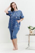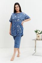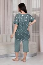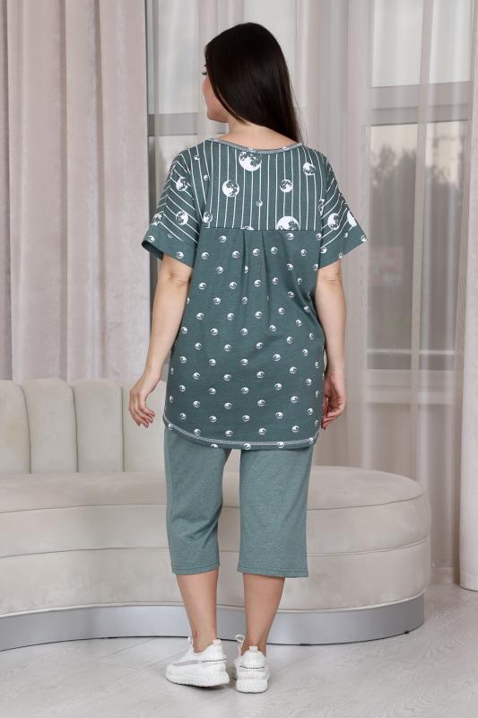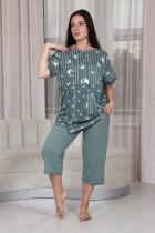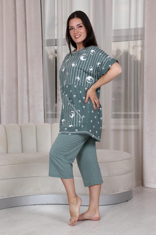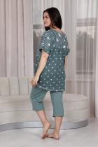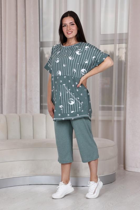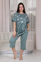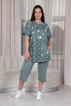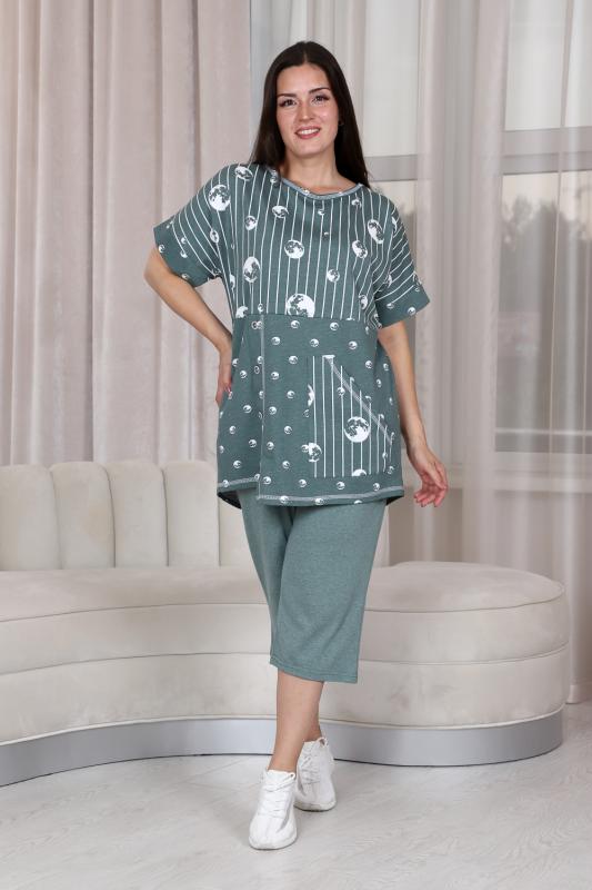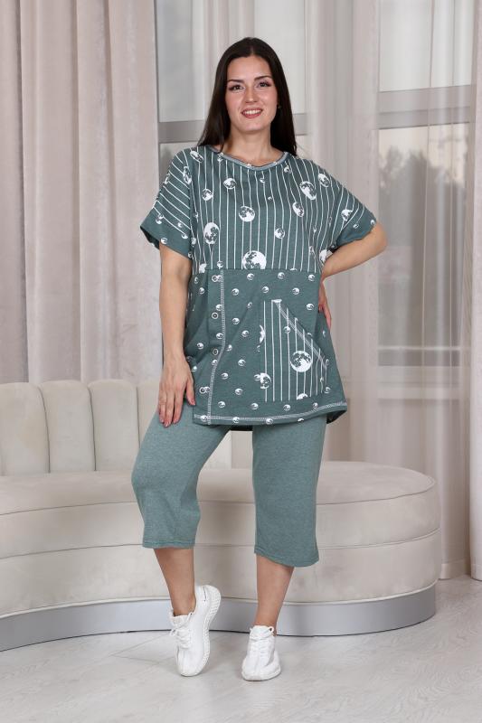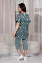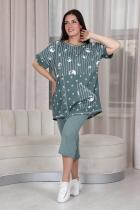 Костюм женский: туника прямого силуэта и капри. Рукав цельнокроенный короткий с манжетой. Верхняя и нижняя часть туники из тканей-компаньонов. В нижней части туники складка с декоративными пуговицами и накладной карман. На передней части брюк внутренние карманы. Пояс выполнен на многоигольной машине.