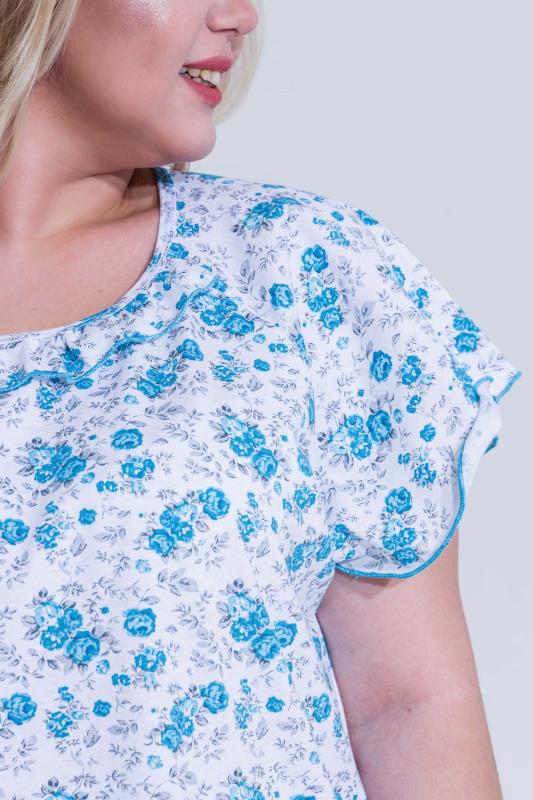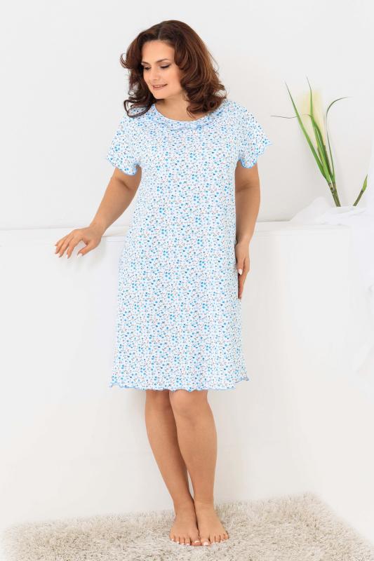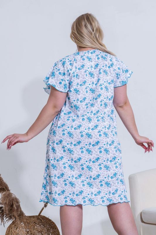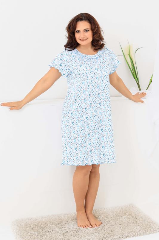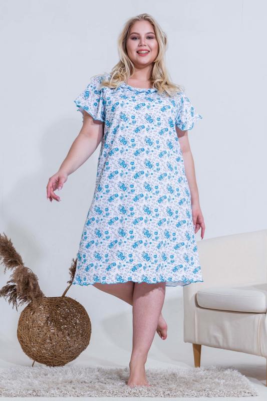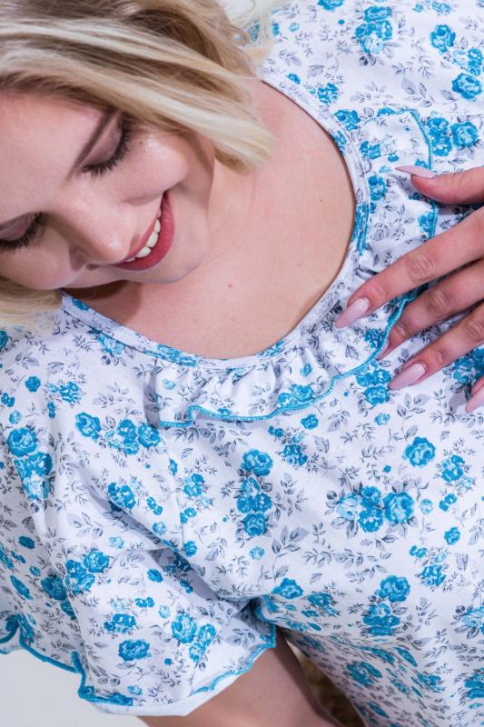 Сорочка женская с симпатичной рюшей по горловине. Очень свободный и удобный крой. Рукав-реглан не стесняет движения рук. Обработка рукава и низа изделия в виде лёгкой волны придаёт лёгкость и воздушность.