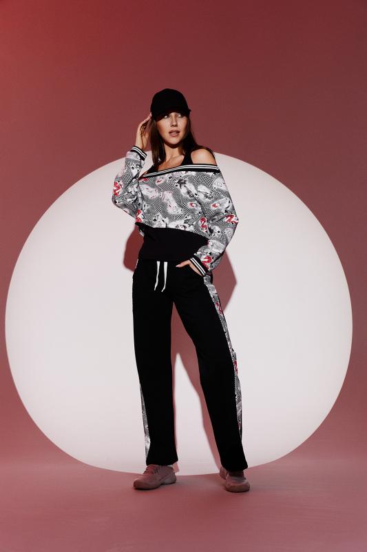 Костюм женский - тройка, состоит из майки прилегающего силуэта, широких, прямых брюк с цветной вставкой по бокам и короткого свитшота свободного силуэта со спущенной линией плеч. Оригинальный, модный костюм, который подойдет для прогулок, встреч с друзьями, активного отдыха и путешествий.