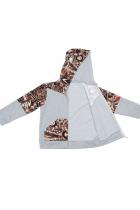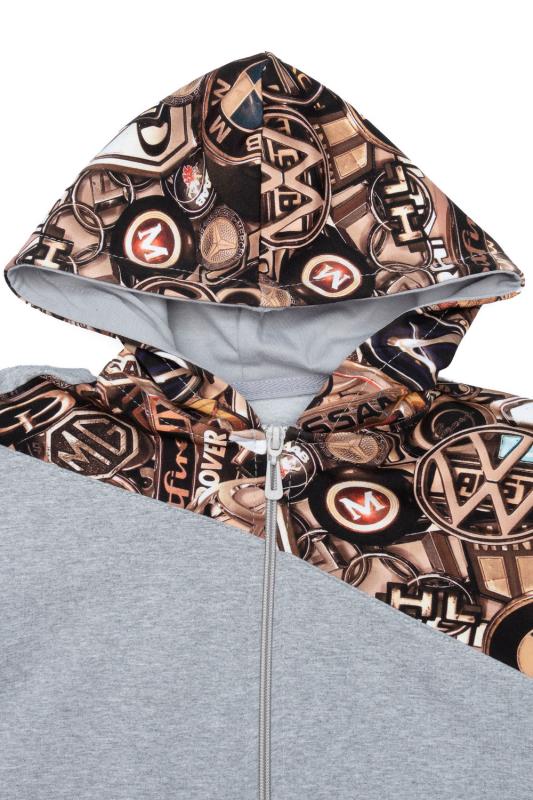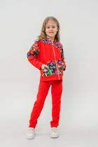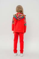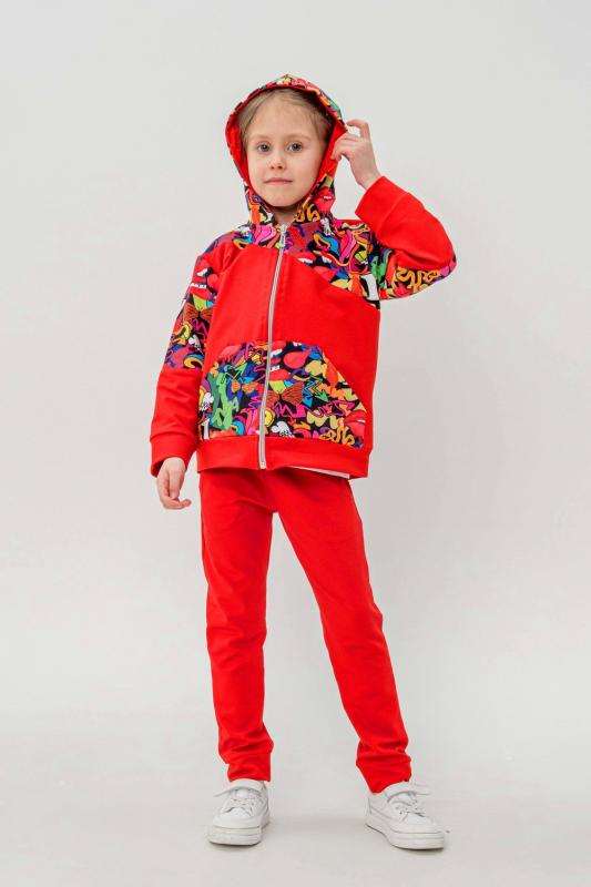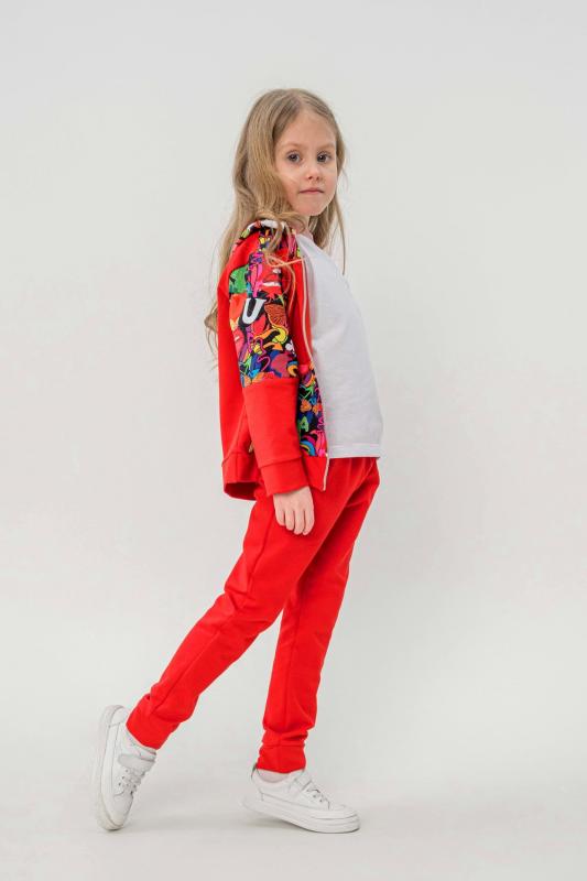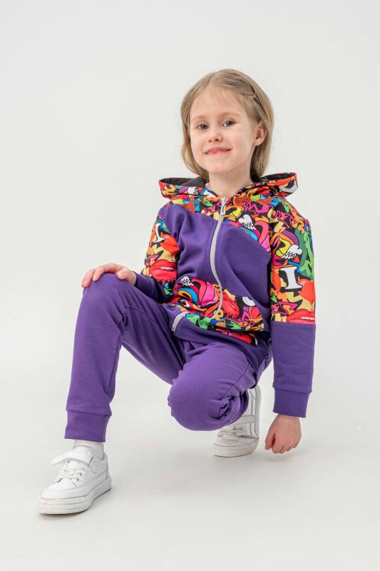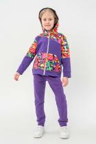 Костюм выполнен из футера двунитки. Комплект из брюк и худи на молнии с капюшоном. Яркие принты на плечах и в центральной части худи. Брюки выполнены в однотонном исполнении со стандартной линией талии.
