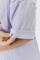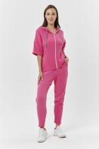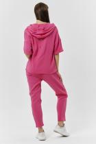 Толстовка прямая, свободная, с капюшоном, на молнии. Рукав короткий, на манжете. На полочке расположены фигурные накладные карманы. Вдоль спинки расположена вставка с декоративными элементами.