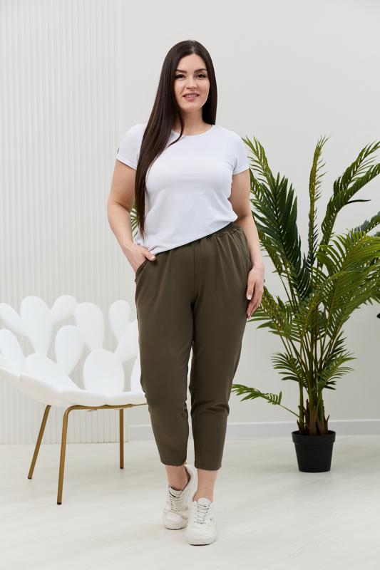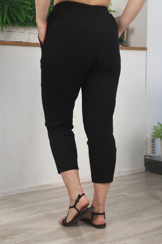 Брюки женские, свободные по бедрам, зауженные к низу. На передних частях брюк внутренние карманы. На задних частях брюк фигурные рельефы, переходящие в боковой шов.