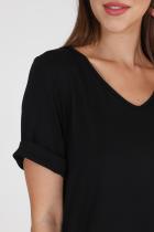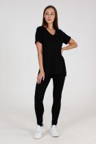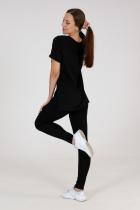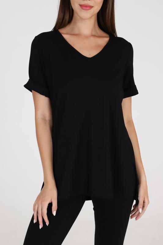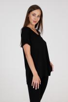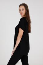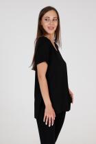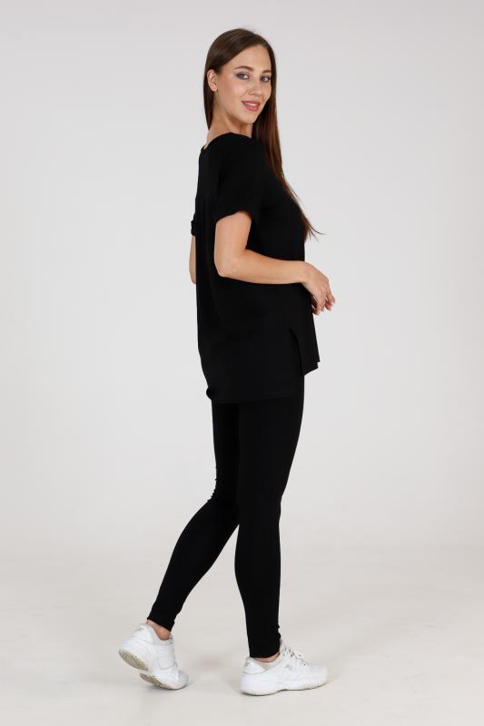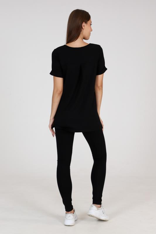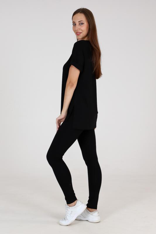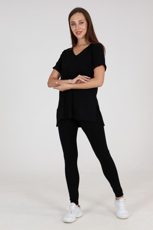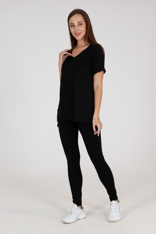 Туника прямого силуэта, с V-образной горловиной, с разрезами в нижней части боковых швов. Спинка с кокеткой, удлиненная. Рукав втачной, короткий, с манжетом. Горловина обработана бейкой из основного полотна.