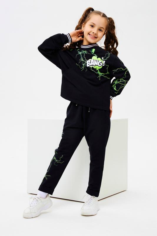 Стильный детский костюм свободного силуэта, состоит из толстовки и брюк с ярким принтом.