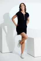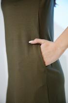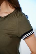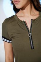 Туника полуприлегающего силуэта, длиной выше колена, с округлой горловиной, с карманами в боковых швах. Рукав втачной, короткий, на манжете из эластичного полотна с контрастными полосками. В верхней части полочки расположена молния. В нижней части боковых швов обработаны разрезы. Горловина обработана обтачкой из основного полотна.