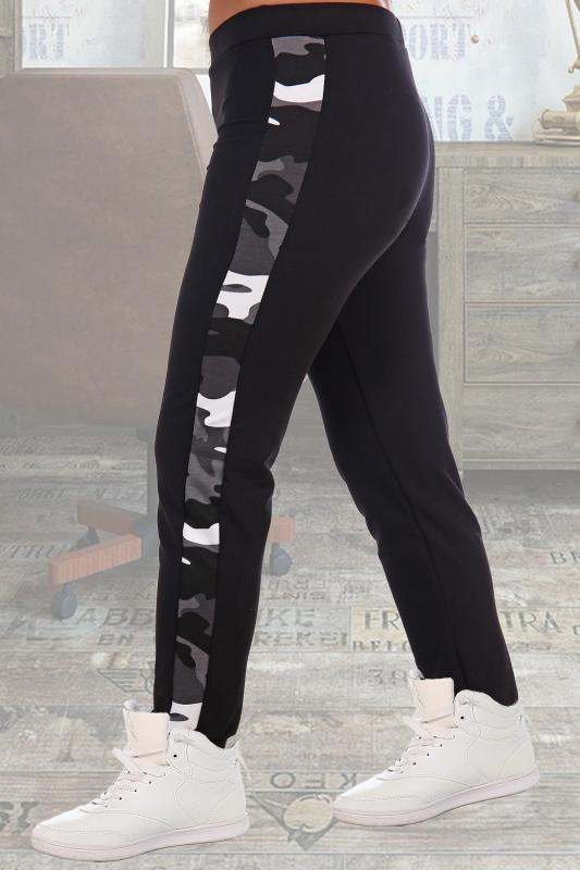 Спортивное трико из футера с лайкрой для мальчиков. Однотонный темный дизайн с камуфлированной вертикальной полосой сбоку, пояс на резинке.