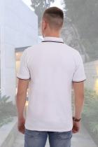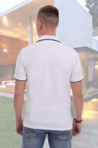 Футболка-поло прямого силуэта для повседневной носки. Отделка - планка с пуговицами, воротник и манжеты вязаные