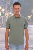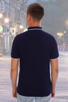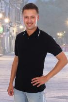 Футболка поло мужская, ткань пике-лакост, плотность 180 г-м3. На полочке планка с тремя пуговицами. Воротник и манжеты вязаные с отделкой по краю контрасной полосой в 0,5 см. Нагрудный карман. Предназначена для повседневной носки.