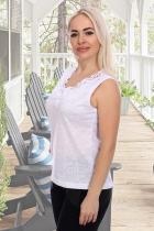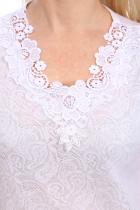 Изделие выполнено из лёгкой ажурной кулирки с гипюром. Ткань очень приятная к телу. Футболку можно носить как под одежду, так и самостоятельное изделие. Горловина украшена большой кружевной вставкой. Благодаря наличию в составе небольшого количества полиэстера, изделие не деформируется после стирки. Ажурный рисунок может быть разный (кружочки, цветы, сердечки и т.д.)