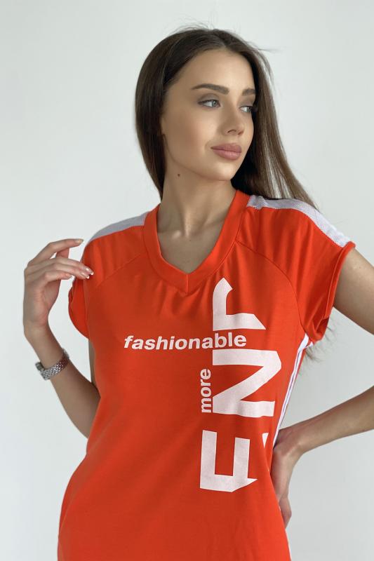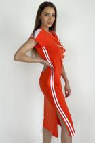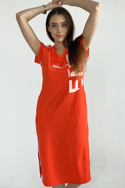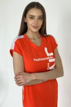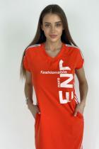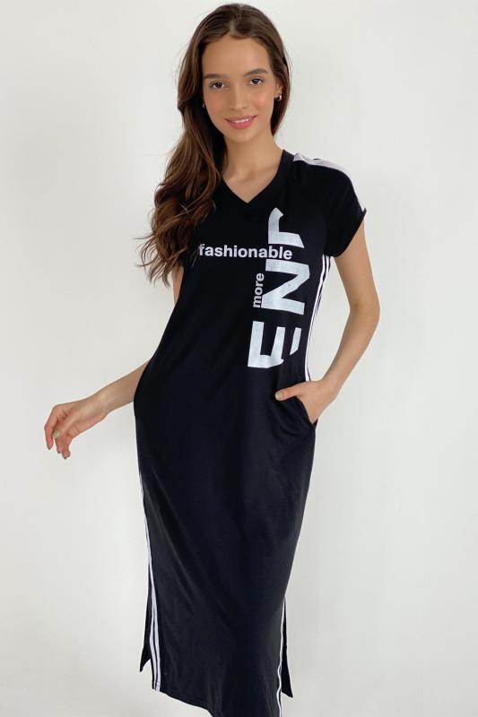 Платье полуприлегающего силуэта, длинное, с V-образной горловиной, с боковыми карманами. Рукав реглан, короткий, со вставкой из сетки. Полочка с лампасами контрастного цвета вдоль боковых швов. В нижней части боковых швов обработаны разрезы. Горловина обработана обтачкой, рукава обработаны бейкой из основного полотна.