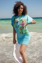 Красивая, универсальная, лёгкая туника свободного фасона. Подходит как для дома, так и для пляжного отдыха. Принт в виде тропической композиции с птичками колибри. Рисунок расположен по диагонали. Длина изделия до середины бедра, свободный, спущенный рукав. Продуманный крой обеспечивает свободу движений и комфорт.