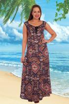 Сарафан женский полуприлегающего силуэта, слегка расклешенный к низу, длинный, в боковых швах разрезы. Линия подреза несколько выше линии талии. На нижней части полочки и спинки рельефы. В верхней части полочки по горловине небольшая сборка, фиксирующаяся завязками. Сарафан выполнен из легкого штапеля с красивым орнаментом.