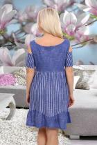 Платье женское молодежное, к низу расширенное, отрезное выше линии талии. Полочка, спинка и волан внизу из однотонной ткани, нижняя часть платья и рукав из ткани-компаньона в полоску.