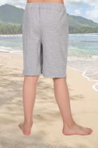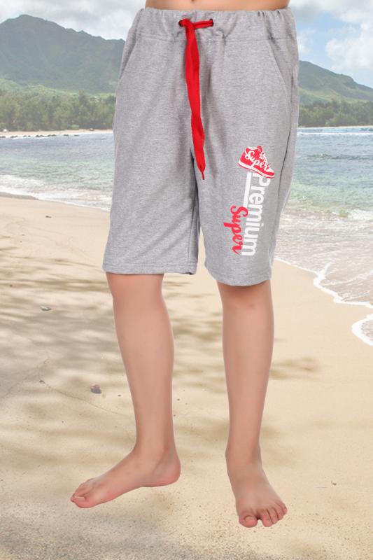Шорты из футера с лайкрой для мальчиков. Принт в виде кроссовка и надписей, пояс со шнурком на резинке, боковые карманы, длина приблизительно до коленей. Две расцветки — серая и синяя. Размеры от 30 до 40. Возможен заказ товара в розницу.