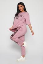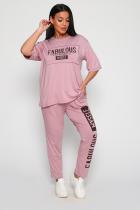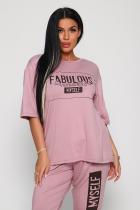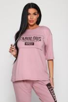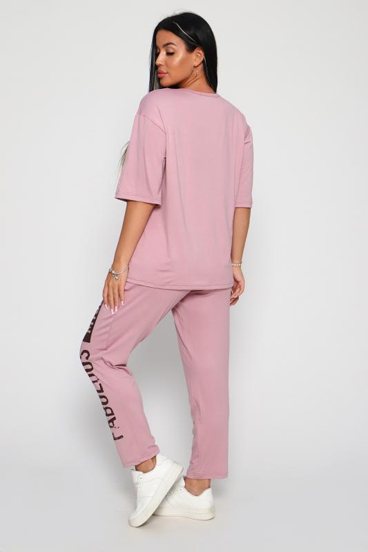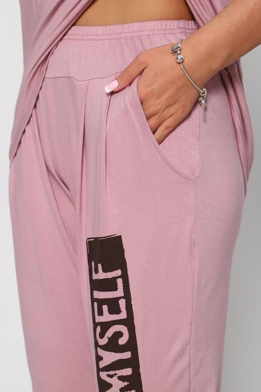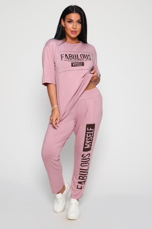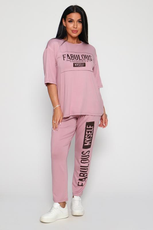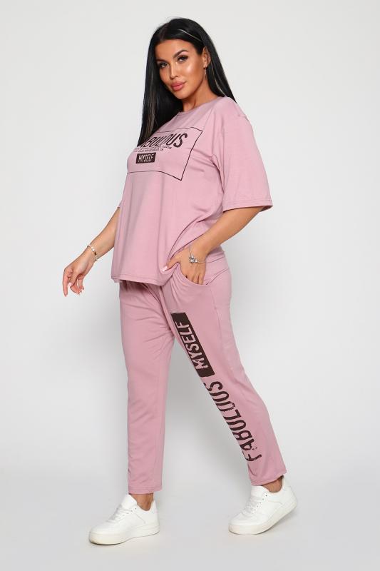 Костюм из вискозы, состоит из футболки и брюк. Футболка свободная, рукав до локтя, горловина обработана под окантовку по переду принт. Брюки по переду со складками, с карманами с принтом на одной брючине, длина до щиколотки. На модели 48-50 размер.
