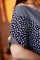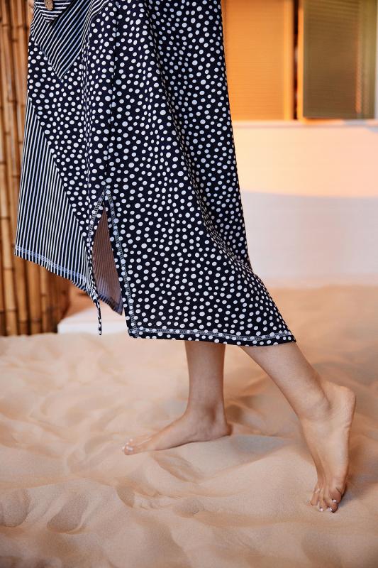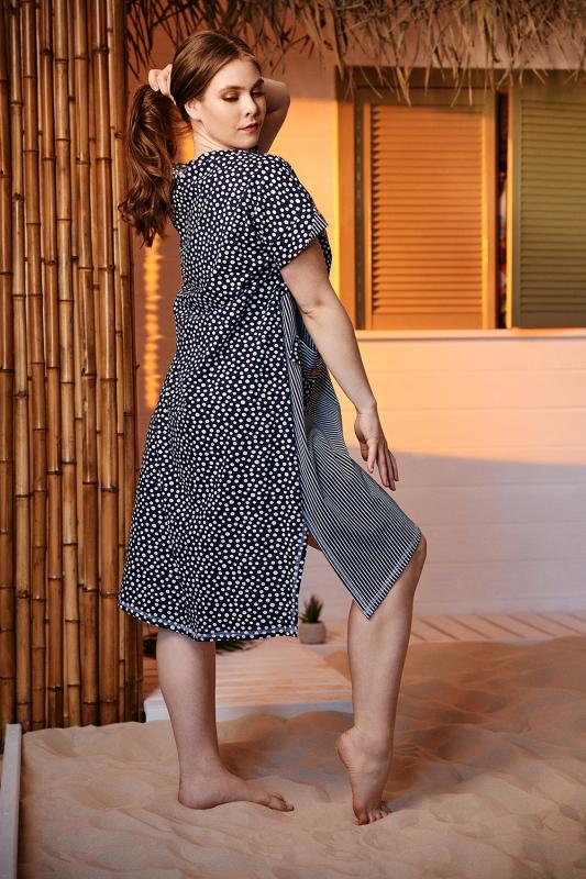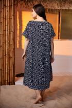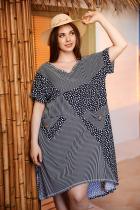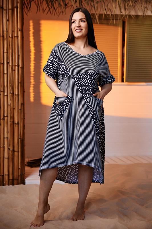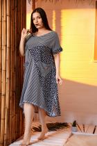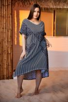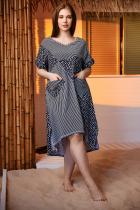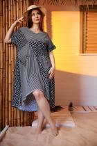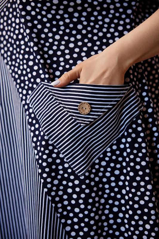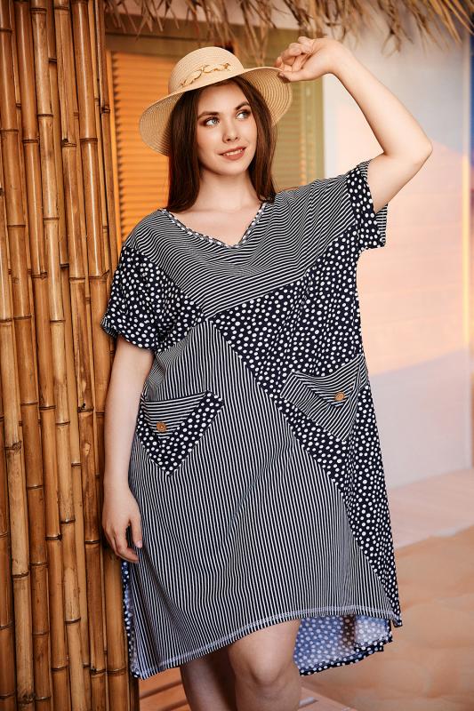 Платье женское, свободное, силуэт трапеция. Рукав короткий цельнокроенный с манжетой. Горловина Y-образная. Полочка состоит из четырех асимметричных частей, две части по диагонали из ткани в горошек, две другие - из мелкой полоски. Низ фигурный, спереди короче, чем сзади. По боковым швам разрезы. На полочках два накладных кармана, форма карманов квадраты, расположенные по диагонали, верхние уголки карманов зафиксированы декоративными пуговицами "