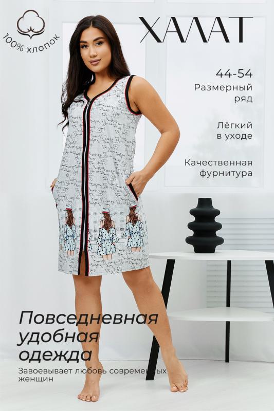 Халат женский на молнии из кулирного полотна 100% хлопок. Халат свободного кроя с прорезными карманами и двойной окантовкой. Халат удобен и практичен. Легкий в уходе.
