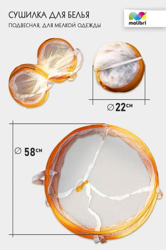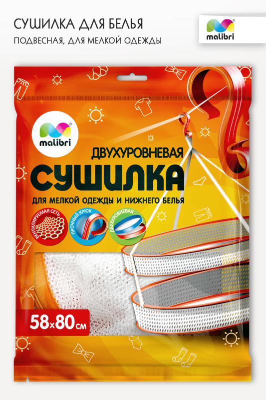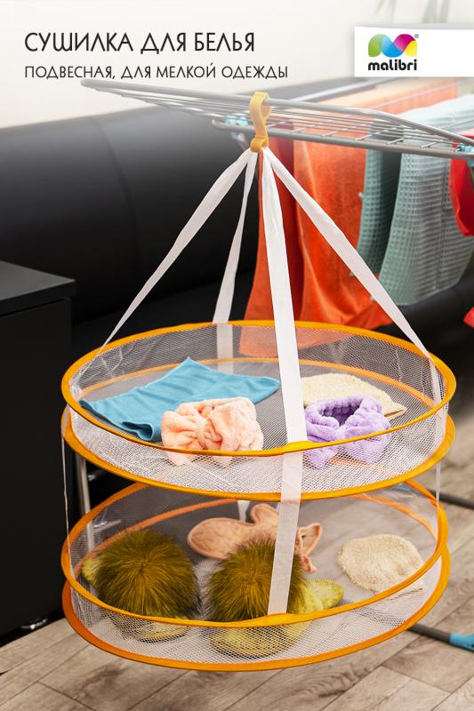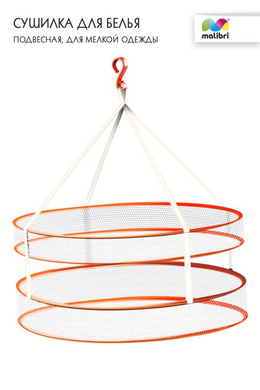 Сушилка MALIBRI двухуровневая подвесная предназначена для сушки лёгкой одежды, нижнего белья, мягких игрушек и т.д. Благодаря крючку, изготовленного из прочной пластмассы, сушилку можно подвесить в любое удобное для вас место. Два уровня сушилки позволяют разложить необходимые вещи, сэкономив при этом пространство. Сетка из 100% полиэстера надёжно удержит ваше белье и позволит ему быстро высушиться со всех сторон. Благодаря диаметру 58 см вы сможете разместить на сушилке достаточное количество белья даже на одном уровне! Высота сушилки в разложенном виде 80 см. Сушилка MALIBRI двухуровневая идеальна для сушки деликатной, мелкой одежды, а также свитеров и другой одежды, которая не подлежит сушке на бельевой веревке. 1. Сушилка из качественного полипропилена - не деформируется, не рвется. Прекрасно выдерживает вес до 5 кг. 2. Подвесной крючок изготовлен из качественного первичного полиэтилена - не ломается, не ссыхается и не тре
